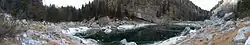 Black Lake (Slovene: Črno jezero) (1,319 metres or 4,327 feet) is the lowest-lying lake in the Triglav Lakes Valley, part of the Julian Alps in Slovenia. It is named for its location in a basin in the middle of the forest, which stretches right to the edge of the Komarča rock face. Because of its relatively low elevation, it is the warmest of the Triglav Lakes. At the surface, its temperature in summer is 9 °C (48 °F), whereas in winter it is 3 °C (37 °F). It is 150 m (490 ft) long, 80 m (260 ft) wide, and up to 6 m (20 ft) deep.[1] The Alpine Newt (Ichthyosaura alpestris), endemic to the Alps, lives in it.