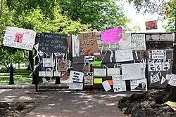 The Black Lives Matter Memorial Fence (BLM Memorial Fence) was a two-block eight-month long protest art installation of Black Lives Matter memorials attached by visitors and community activists to the chain link fence outside the White House on H Street, between Vermont Avenue and Connecticut Avenue NW in Downtown Washington, D.C. in 2020 and 2021. The 1.7-mile (2.7 km) cordon of fencing around the White House was erected to move the growing crowds of protesters gathered at and around Lafayette Park after the murder of George Floyd on May 25, 2020.[1] The Memorial Fence developed from June 2020 until it was dismantled and archived in January 2021. Members of the public worked together to maintain, protect, and then archive the thousands of signs and artworks that were offered by the public.
