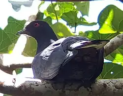 The black imperial pigeon was originally described as Carpophaga melanochroa by the English zoologist Philip Sclater in 1878 based on specimens from the Duke of York Islands.[3] By 1925, it had been moved to its current genus, Ducula.[4] The generic name Ducula is from "dukul", the Nepali name for imperial pigeons. The specific name melanochroa is from the Ancient Greek word melanokhrōs, meaning black-skinned.[5] Black imperial pigeon is the official common name designated by the International Ornithologists' Union.[6] Other common names for the species include Bismarck imperial pigeon and silver-laced imperial pigeon.[7][8]