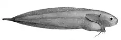 The black seasnail has a long and tapering body (maximum 25 cm (9.8 in)), black and grey in colour, with large head, dorsal and anal fins that run the length of the body, and a much reduced caudal fin, although it has no adhesive disc, unlike other snailfish. The pectoral fins have two lobes, the lower having 3–4 rays.[6]