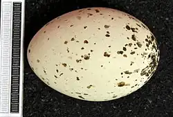 The black vulture lays its eggs on the ground in a wooded area, a hollow log, or some other cavity, seldom more than 3 m (10 ft) above the ground.[34] While it generally does not use any nesting materials, it may decorate the area around the nest with bits of brightly colored plastic, shards of glass, or metal items such as bottle caps.[45] Clutch size is generally two eggs, though this can vary from one to three. The egg is oval and, on average, measures 7.56 cm × 5.09 cm (2.98 in × 2.00 in). The smooth, gray-green, bluish, or white shell is variably blotched or spotted with lavender or pale brown around the larger end.[45] Both parents incubate the eggs, which hatch after 28 to 41 days.[45] Upon hatching, the young are covered with a buffy down, unlike turkey vulture chicks which are white.[51] Both parents feed the nestlings, regurgitating food at the nest site. The young remain in the nest for two months, and after 75 to 80 days, they can fly skillfully.[47] Predation of black vultures is relatively unlikely, though eggs and nestlings are readily eaten if found by mammalian predators such as raccoons, coatis and foxes. Due to its aggressiveness and size, few predators can threaten the fully-grown vulture. However, various eagles may kill vultures in conflicts, and even the ornate hawk-eagle, a slightly smaller bird than the vulture, has preyed on adult black vultures, as well as the two eagles native to North America (north of Mexico).[32][52][53]