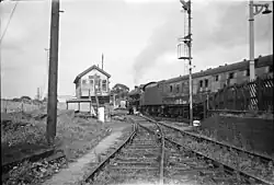 There were two platforms, that on the down (Southward)[3] line being exceedingly long - much longer than that on the upside. Access to it was by a barrow crossing to the South, there being no footbridge. There were short goods sidings for each line running into bay platforms, with an extra one on the upside. The entrance and booking hall were on the up platform, with a small waiting room on the other side. Construction was of typical Midland Railway brick-built design, with wooden awnings.