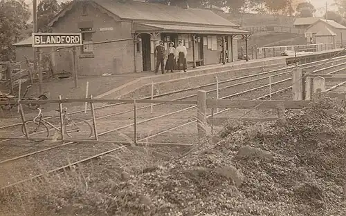 Blandford station was opened in 1872,[1] and was the only intermediate station constructed when the Great Northern Railway was extended from its previous terminus at Wingen, to Murrurundi, as it was justified to serve the "influential squatters and residents" living in the town.[2]