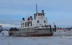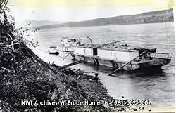 George Askew 1945 Steam-powered sternwheeler (27 m (87 ft) long, 6.4 m (21 ft) wide, 1.2 m (4 ft) draft, 135 hp (101 kW) engine) owned by the Northern Transportation Company Limited on the Slave River-Mackenzie River routes 1945–1958.[42] In 1966, the boat was beached in Norman Wells and being used as NTCL crew quarters. The Inuvik Chamber of Commerce was interested in preserving the boat as a monument at that time.[43]