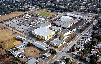 Ground was broken for a $1.34-million school in December 1952, the first new high school built in southern Pinellas County in 26 years. It was open-air with a central administration building and classrooms extending out in a series of parallel wings to take advantage of the Florida weather by providing maximum natural light and exposure for each classroom.[3] In July 1953, the school board chose Boca Ciega (after the nearby bay) as the school's name over Gulfport, Sunshine City, Sun City, Central, Gulf Coast, 58th Street, and Southwest St. Petersburg. Prospective students chose gold (for the Sun) and white (for sand) as the school colors and "Rebels" as the nickname. In September 1953, BCHS opened with 964 students in grades 9–12. The first principal, Richard L. Jones, declared there would be no "rebels" at his school; in another vote, students chose "Pirates."[4] Ironically, Rebels was later adopted as the nickname of the school's cross-town rival, Dixie Hollins High School. The school's alma mater (anthem) was arranged by George Shakley, with words by Kathryn Ludlum (revised by Robert Drick in 1976).