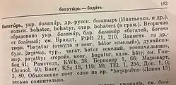 The word bogatyr is not of Slavic origin.[4] It derives from the Turco-Mongolic baghatur "hero", which is itself of uncertain origin. The term is recorded from at least the 8th century.[5]
