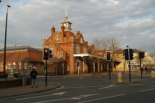 Bognor station suffered partial destruction twice: it was blown down in a gale in 1897, and then burned down in 1899.[8][9] The present station buildings by the company architect C.D. Collins[10] date from 1902 and have achieved grade II listed building status[1] as a complete example of an Edwardian period seaside station terminus.[11][12]