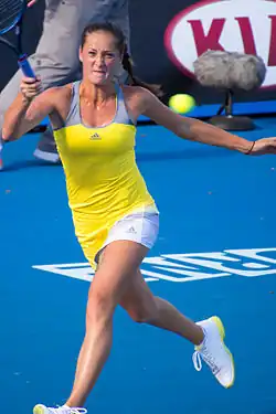 Jovanovski played her first event of the season at the Shenzhen Open, where she was seeded eighth. She defeated Alexandra Cadanțu in the first round and Duan Yingying in the second, but lost in the quarterfinals to Li Na, who went on to win the tournament.[90] Jovanovski then played in Hobart where she defeated María Teresa Torró Flor, before losing to Kirsten Flipkens in the second round.[91] At the Australian Open, Jovanovski again defeated Torró Flor, the 17th seed Lucie Šafářová, and Kimiko Date-Krumm, before losing to eventual semifinalist Sloane Stephens in the fourth round. This had been her best career Grand Slam performance.[92] In doubles, Jovanovski partnered with Melinda Czink to triumph over Simona Halep and Arantxa Rus in the first round, but then fell to Natalie Grandin and Vladimíra Uhlířová.[93]