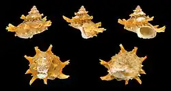 The shell has an equilateral-triangle profile, being approximately as tall as it is wide. The whorls are slightly inflated and are sculpted with strongly beaded spiral threads and a row of splayed hollow spines along the shoulder. A smaller second row of spines is situated below the shoulder on the last whorl. The base color of the shell is lavender to reddish purple with golden maculations outlined in a darker purple. The base has strong spiral threads which are weakly beaded and is paler in color than the body, with scattered darker and lighter beads along the threads. The siphonal canal is closed and is ivory white near the aperture with a golden yellow to orange edge adjacent to the base. The aperture is white and nacreous. The size of the adult shell varies between 30 mm and 80 mm.