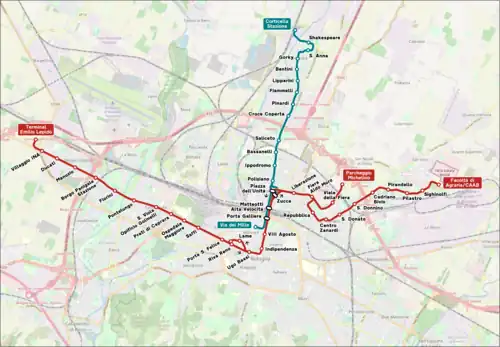 - Red line: from Borgo Panigale to Centro Agro-Alimentare di Bologna, via Bologna Centrale railway station[4]