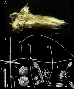 Specimen: AMegascleres: B, D, and E: hexactines, C: diactin, F: close view of a hexactine distal ray, Microscleres:G and H: discohexasters, I and J: codonhexasters, K: anchor-like end of a condonhexaster