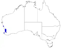 This boronia grows in eucalypt woodland in the Darling Range between New Norica and Boddington in the Avon Wheatbelt, Jarrah Forest and Swan Coastal Plain biogeographic regions.[2][3]