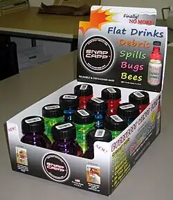 Originally named the Snap Capp, the product was invented in Medford, Oregon by David Gran and Carl Stufflet (a heating and air-conditioning service manager), who became frustrated over repeatedly spilling his beer during a Disc golf competition.[3] While camping later that day, Mr. Stufflet took out a knife and cut off the top of his plastic Pepsi bottle and melted it onto his can with a lighter, thereby creating the first Snap Capp.[4]