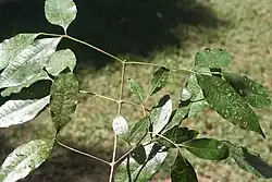 Plants in the genus Bouchardatia are shrubs or trees with compound leaves arranged in opposite pairs, the leaves with three or five leaflets, rarely two or the leaves simple. The flowers are bisexual with four sepals fused at the base, four petals that are free from each other but overlapping each other, and eight stamens that alternate in length. The fruit is of up to four ridged follicles joined at the base with a woody exocarp. Each follicle contains a single shiny brown seed.[2][3]