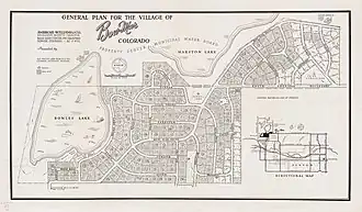 As Denver grew in the post-World War II era, Bow Mar farmland was purchased to develop the area into single-family housing. Homes were first constructed in what is now Bow Mar in the late 1940s and early 1950s. In 1947, the first home was built in Bow Mar by land developed by Lloyd and Eleanor King.[8] The neighborhood was largely built up by the end of the 1950s. Bow Mar was incorporated as a town in 1958[8] as a town that straddled both Arapahoe and Jefferson counties. When built, many homes in Bow Mar reflected Frank Lloyd Wright's prairie-style architecture. Homes were constructed upon acre lots and were placed on wide streets, and were limited to being no more than one story tall. Today, many houses in the area are being updated or replaced with new construction. Bow Mar has never had its own post office.[9]