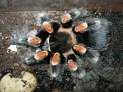 Brachypelma smithi is a species of spider in the family Theraphosidae (tarantulas) native to Mexico.[3] It has been confused with Brachypelma hamorii; both have been called Mexican redknee tarantulas.[4] Mexican redknee tarantulas are a popular choice as pets among tarantula keepers. Many earlier sources referring to B. smithi either relate to B. hamorii or do not distinguish between the two species. B. smithi is a terrestrial tarantula native to Pacific coast of the Mexican state of Guerrero.[4]