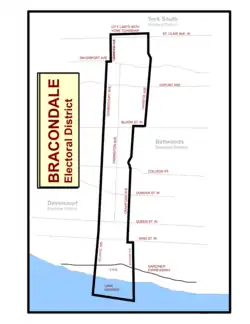 Bracondale was a long and narrow constituency, ranging from the Canadian National Exhibition Grounds in the south to the city limits at St. Clair Avenue in the north, in Toronto's west-end. It included parts of the present-day neighbourhoods of Bracondale Hill, Davenport, Dovercourt Park, Dufferin Grove, Little Portugal, and Liberty Village. Its southern boundary was Lake Ontario. Its eastern boundary started on the west side of Strachan Avenue. It went north on Strachan to Queen Street West and jogged westward along Queen's south side to Crawford Avenue. It then went north on Crawford's west side until Dundas Street West, where it went eastward along the northern section of Dundas to Beatrice Street. It went north on Beatrice's west side straight through to Bloor Street West. It then jogged east on Bloor's north side to Christie Avenue. It then went along Christie to the northern boundary, the city limits just north of St. Clair Avenue West. It jogged westward along the city limits to Oakwood Avenue. It then went south along Oakwood's eastside to Davenport Road. It then jogged along Davenport's south-side to Dovercourt Road. It then went south on Dovercourt's east-side to Atlantic Avenue. On Atlantic's east-side to Lake Ontario.[10][11]