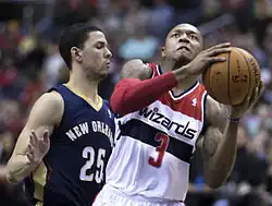 On November 4, 2015, Beal scored a game-high 25 points and made a three-pointer with 0.3 seconds remaining to lift the Wizards to a 102–99 win over the San Antonio Spurs.[20] Beal had an injury-plagued season in 2015–16, as he missed three games in mid-November with a shoulder injury,[21] and 16 games between December 11 and January 11 with a lower right leg injury.[22] He had another stint on the sidelines in early March, missing three games with a sprained pelvis.[23] He played in a career-low 55 games in 2015–16, and made a career-low 35 starts, but did record a career-high 17.4 points per game.[24]