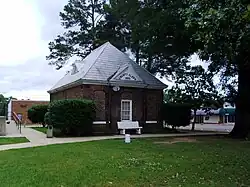 The Bradley County Courthouse has a two-tone brick exterior with quoin arched windows as well as gauged voussoirs and dentils along the cornices. A tower in one corner of the structure has clocks facing all four directions, an arched cupola, and a hexagonal shaped roof.[4] Also included on the National Register of Historic Places is a one-story brick building built in 1890. Originally the county clerk's office, the building now serves as a library.