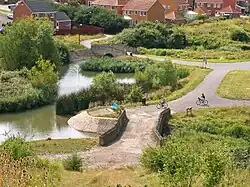The Woodland area of Bradley Stoke is named Three Brooks Local Nature Reserve, an area of approximately 44 hectares (110 acres)[26] that includes bluebell woods, rough grassland, brooks, ponds, and the man-made Three Brooks Lake. The lake, part of the Frome Valley Relief Sewer,[27] is home to many common species of waterfowl including nesting swans. There are also a number of other walks and paths surrounded by small wooded areas connecting various parts of Bradley Stoke. Wild fruit can be found throughout the woodland, namely blackberries, apples, plums and cherries. A community orchard grows in the heart of the woodland.