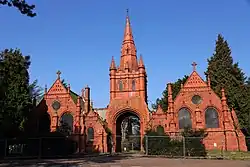 The two semi-detached mortuary chapels stand at the highest point in the cemetery grounds, and provide a dramatic central focus for the cemetery. The chapels are joined by a carriage entrance archway (a porte-cochčre), which is surmounted by a tower and spire.[2][3] The twin chapels were designed by Mr J. Brewin Holmes,[2][3] a Birmingham architect,[2] and are built in the Gothic style[1][2] with Art Nouveau details[2] from red brick and terracotta.[3] The mortuary chapel on the east was for Non-conformists[2] and the chapel on the west consecrated for Anglican services.[2][3] The chapels are mirror images of each other, containing: a chancel, a coffin chamber, a vestry and an underground heating chamber. There is also a Cemetery Lodge, built from red brick and terracotta, which contained the cemetery offices and living quarters for the cemetery Superintendent.