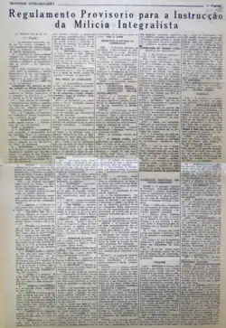 The Integralist militias were present throughout the Brazil's territory. In December 1933, just over 1 year after the creation of the Brazilian Integralist Action, it is already possible to find reference in the newspaper Monitor Integralista, which indicated in its pages, about the Integralist militia in the Federal District, it already had "1,800 green-shirts, workers, students, civil servants, doctors, engineers, lawyers, small industrialists and those employed in commerce".[3]