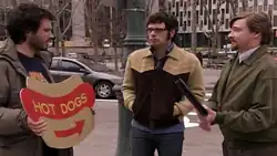 "Boom"[1] is an inner monologue sung by Bret while conversing with Coco, the attractive new sign holder. The song is performed in an electronic/dancehall style similar to that of Jamaican artist Shaggy.[3] The lyrics centre around his attraction to Coco but are distinguished by the fact that nearly all nouns are replaced by the word "boom". The accompanying video features Bret and Coco dancing in front of an animated background and has strong similarities to The Black Eyed Peas' "Hey Mama" video.[4] Also featured prominently during this sequence is a 1980s Casio DG20 digital guitar (set to mandolin).