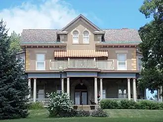 The most prominent of the residences was built by Ambrose Fulton, who was significant to Davenport's early settlement and its industrial history.[4] He was an early and aggressive promoter of the new town. Fulton was involved in multiple industries including flour mills, railroads, river commerce, land speculation, and retail commerce.[2] Of the four oldest houses in the district, three are Italianate, including the Fulton House, and one is Second Empire. Three of the four houses feature quoined corners similar to that of the Fulton residence even though they are built of wood. Quoining is rare in Davenport's residential architecture and its noticeable incidence here suggest others were emulating Fulton.[5] Besides Fulton, three other prominent members of the Davenport community built houses on Bridge Avenue. John B. Carmichael dealt in books, stationary, and wallpaper; Josiah Dow owned a grain mill; and John Forrest was a local politician and commercial developer.[5] Forrest is also responsible for the Forrest Block downtown.[2] Josiah's wife Maggie built a duplex on Bridge Avenue after her husband's death.