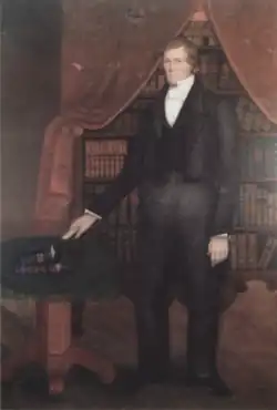 At a conference on February 14, 1835, Brigham Young was named and ordained a member of the Quorum of the Twelve Apostles.[33][34] On May 4, 1835, Young and other apostles went on a mission to the east coast, specifically in Pennsylvania and New York. His call was to preach to the "remnants of Joseph", a term people in the church used to refer to indigenous people.[35][36] In August 1835, Young and the rest of the Quorum of the Twelve issued a testimony in support of the divine origin of the Doctrine and Covenants.[37] He oversaw the finishing of the Kirtland temple and spoke in tongues at its dedication in 1836.[38] Shortly afterwards, Young went on another mission with his brother Joseph to New York and New England. On this mission, he visited the family of his aunt, Rhoda Howe Richards. They converted to the church, including his cousin Willard Richards.[39][31] In August 1837, Young went on another mission to the eastern states.[40] He then returned to Kirtland where he remained until dissenters, unhappy with the failure of the Kirtland Safety Society, forced him to flee the community in December 1837. He then stayed for a short time in Dublin, Indiana, with his brother Lorenzo before moving to Far West, Missouri, in 1838. He was later joined by his family and by other members of the church in Missouri.[41] He became the oldest member of the Quorum of the Twelve Apostles when David Patten died after the Battle of Crooked River.[42] When Joseph Smith arrived in Far West, he appointed Young, along with Thomas Marsh and David Patten, as "presidency pro tem" in Missouri.[43]