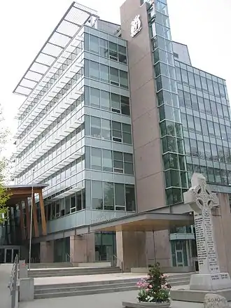 In 1947–48 the Lulu Theatre opened.[12] In 1958, the municipality purchased the racetrack from the BC Turf and Country Club, developing it to become Minoru Park. Opening within the park area were the then outdoor Centennial Pool (1958), running track (1960), sports pavilion (1964–2014), stadium rink (1965),[13] library (1976–1992),[12] aquatic centre (1977), and activity centre (1986-2019).[13] The Cultural Centre (1993) houses the library Brighouse branch, arts centre, archives, and museum.[14] The Caring Place (1994–2019) provided social services. On the east side of Minoru Blvd., Richmond Square Shopping Centre (1963) later developed into Richmond Centre. In 2015, Sears, the anchor in the southern section, closed. High-rises will replace the vacant store and carpark building.[12] On the No. 3 Rd/Granville corner, the city hall was rebuilt in 2000.[15]
