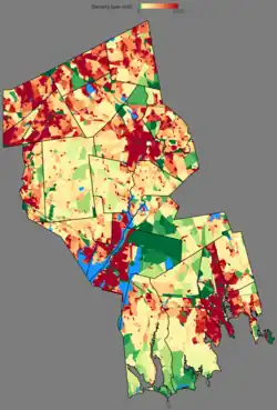 At the 2000 census there were 534,678 people, 205,411 households, and 140,706 families in the county. The population density was 962 inhabitants per square mile (371/km2). There were 216,918 housing units at an average density of 390 per square mile (150/km2). The racial makeup of the county was 90.98% White, 2.03% Black or African American, 0.24% Native American, 1.26% Asian, 0.03% Pacific Islander, 3.12% from other races, and 2.34% from two or more races. 3.60%[12] was Hispanic or Latino of any race. 29.7% were of Portuguese, 13.0% Irish, 8.9% French, 8.2% English, 6.8% Italian and 6.4% French Canadian ancestry according to Census 2000. 79.1% spoke English, 13.9% Portuguese, 2.9% Spanish and 1.6% French as their first language. The United States Census Bureau reported Bristol County as being one of two counties in the United States with a plurality of people of Portuguese ancestry[13] (the other being the contiguous Bristol County, Rhode Island).