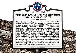Bristol Municipal Stadium, also referred to as the Stone Castle, is an athletic facility located on the campus of Bristol Tennessee High School in Bristol, Tennessee. The structure features a design that is reminiscent of Medieval Gothic architecture and has a seating capacity of approximately 8,000. The stadium currently serves as the home field of the football team of Tennessee High School. The structure was added to the National Register of Historic Places in 1987.
