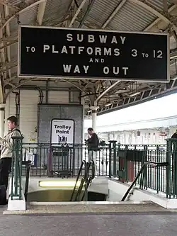 In the late 1960s the Royal Mail built a mail conveyor at the northern end of the station, with significant aesthetic impact. This was out of use for many years following the transfer of Royal Mail's activities to the West of England Mail Centre at Filton and the opening of the short-lived Railnet Hub next to Bristol Parkway station in May 2000.[19] It was finally dismantled in stages and removed between October and December 2014.[20] In 1990/91, £2 million was spent by InterCity on a renovation of the main train shed and another £7 million on restoring some of the older areas of the station, including the refurbishment of the subway and construction of new retail outlets. The shorter of the two 1935 platform islands had been used only for parcels traffic since the 1960s but was temporarily brought back into passenger use during this work. It was fully restored for passenger use in 2001.[13]