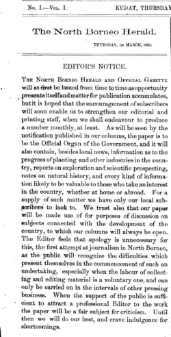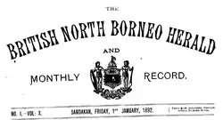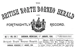 In 1883, Sandakan was raised as the new capital instead of Kudat, and this herald moved their place of publication to the new administration area.[3] The editorial and printing from 1885 to 1891 were by W. J. Rozario.[4] From 1 January 1896, the herald turned into a four-day appearance. The price per issue was still 10 cent, while the annual subscription including postal delivery increased to 2.50 Straits dollar.