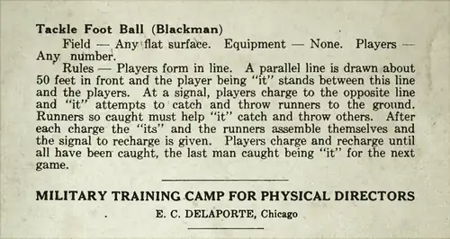 Prototype of British Bulldog from October 1918. A variation of the game of Black Man, taken from the Manual of Physical Training and Recreation in Army Camps, Mind & Body Publ. Co., Minnesota 1918.[32]