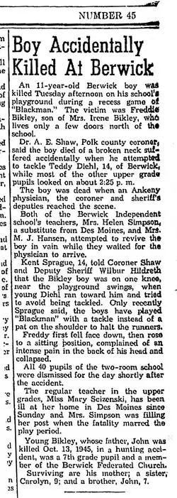 Newspaper article from November 24th, 1899, describing the deadly head injury of a young boy caused by a football "pile-on" during a game of "Black Man"[66]