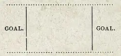 Two parallel lines are marked off from side to side straight across the center of the playground, leaving a narrow space between them of about ten feet in width, which represents the building ground for the wall.[94][92] On each end of the playground, a line is drawn across parallel to the building ground at a distance of fifteen to thirty feet, which marks the goal for the runners. One of the players is chosen to create the wall on the building ground, and takes his place upon it, facing all the other players who line up in one of the goals.[92] At an agreed signal (e. g. "Start!" or a similar call), the runners must cross the building ground to reach the opposite goal, the builder endeavoring to tag as many as possible during their rush without leaving the boundaries of the marked ground himself.[92] All the runners caught that way become a "stanchion" of the wall and assist the builder in trying to capture the rest of the players. After crossing the ground several times, the remaining runners must attempt to break through the increasing wall, which gradually becomes denser due to the growing number of catchers. Anyone refusing to break the wall is automatically considered caught.[94] The game ends when all of the runners have been caught, the last player taken being the "builder" for the next game.[92][95]