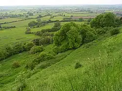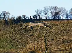 Broad Town White Horse is carved facing west on a long, grass-laden, 45° steep slope (450 metres above mean sea level) above the Little Town Farmhouse that is situated half a mile outside the village of Broad Town.[3] The hill that the horse is cut on used to belong to the farm,[4] and is located on the most western limit of the same escarpment where Uffington White Horse is cut, overlooking the farthest end of the Vale of the White Horse.[5] The horse is 60 feet (18 metres) in height and 80 feet (24 metres) in length,[6] and is "composed of fine compacted chalk."[3] It is the third smallest of the eight canonical white horses in Wiltshire.[6] The horse ties "neck-and-neck" with Hackpen White Horse as the closest white horse to Swindon.[7]