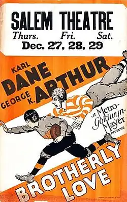 Brotherly Love is a 1928 sound part-talkie comedy film produced and distributed by Metro-Goldwyn-Mayer and directed by Charles Reisner. It is a starring vehicle for the comedy team of Karl Dane and George K. Arthur. Young Jean Arthur supports the comedy duo. In addition to sequences with audible dialogue or talking sequences, the film features a synchronized musical score and sound effects along with English intertitles. The soundtrack was recorded using the Western Electric sound-on-film system.[1][2]
