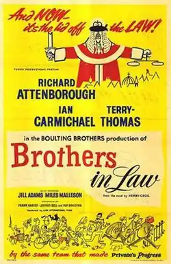 Brothers in Law is a 1957 British comedy film directed by Roy Boulting and starring Richard Attenborough, Ian Carmichael, Terry-Thomas and Jill Adams.[1][2] It was written by Boulting, Jeffrey Dell and Frank Harvey Jr., adapted from the 1955 novel Brothers in Law by Henry Cecil, a comedy set in the legal profession.[3] The film is one of the Boulting brothers' successful series of institutional satires that begun with Private's Progress in 1956.[4]
