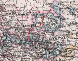 In Gliesmarode Schuntertalbahn branched off, forming a link to the Lehrter Bahn. It was opened on 31 August 1902 as far as Brunsrode-Flechtorf and on 1 November 1904 to Fallersleben by the BLE. This terminal, like two sections of the line at Derneburg and Bockenem was not in Brunswick territory, but in Prussia. In fact a total of 36 km of line was on Prussian territory – one third of the total track length.