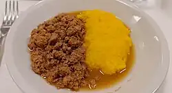 Bruscitti (Italian: [bruˈʃitti]; Lombard: brüscitt, Lombard: [bryˈʃit];[1] lit.'crumbs')[4] is an Italian single-course meal[5] of the Lombard, Piedmontese, and Ticinese cuisines based on finely chopped beef cooked for a long time.[6] It is a typical winter dish[7] and is served with polenta,[8] purée,[9][10] or risotto alla milanese.