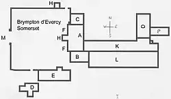Brympton d'Evercy, stages of construction. A:Hall 1450; B:1460; C:Nether parlour 1520; D:Church 14th century; E:Priest House 15th century; F:West front 16th century G:Porch 1722 H:Clock tower (original porch); K:Staircase hall, possible site of earlier manor; L:State rooms 1680?; O:Kitchen 16th century; P:Farmhouse