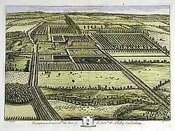 Brympton d'Evercy from the south around 1722, by Jan Kip and Leonard Knyff