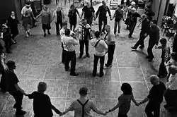Wedding bands may contain both Bulgarian and Gypsy musicians who are master improvisors. Their instruments may include accordion, clarinet, electric bass, saxophone, and synthesizer.[8] A chief characteristic is loudness.[9] In Bulgaria, wedding music has a pivotal role in the rituals known as daruvane (meaning: reciprocal exchange of gifts), in the banquets, and the dancing that follows and is performed for several hours. There are two categories of wedding music which are popular in the Bulgarian music culture. One is the Bulgarian wedding music and the other is Roma music. Bulgarian wedding music in particular covers a wide repertoire and includes "all the additive meters of traditional music, but favors pravo horo (2/4), rachenitsa (7/16, 2-2-3), and lesno."[10] The music, considered "heartfelt", is akin to the Middle Eastern, Mediterranean, and East European forms.[5] However, wedding musicians encounter several issues within their industry, such as auditions, registration, ethnicity, freedom, money, and nationalism.[11]