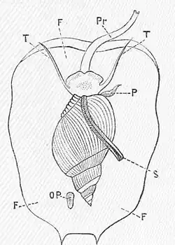 Bullia laevissima Gmel, showing branchial siphon S; F,F,F, foot; OP, operculum; P, penis; Pr proboscis; T, T, tentacles