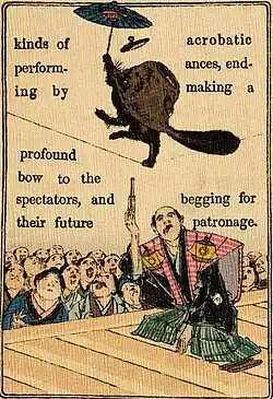 The priest and his novices[f] subdue it, and since it reverts to the form of an ordinary kettle, they sell it to a traveling tinker[14][10] or rag-peddler.[9][g] The kettle reveals its half-tanuki form to the peddler,[h] and the merchant acts on a friend's advice to command the beast to turn tricks,[14] or, is persuaded by the tanuki itself, which bargains to perform acrobatics in exchange for being well-treated. The peddler agrees to neither put it over hot flame nor stow it away in a stuffy box, and share what food he has.[10][9]