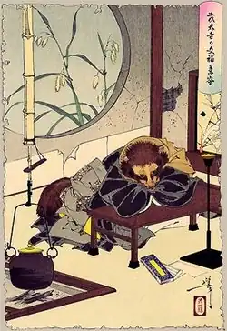 One example is an edition of Bunbuku chagama printed by Urokogataya, dating to c. 1735–45.[n][47] The storyline is as follows. A monk named Bunbuku serving Lord Higashiyama in Kyoto[o] captures an old raccoon dog (mujina) by causing the creature to lower its guard by joining the monk in dance. Bunbuku and his comrades, the four tea monks, decide to butcher the creature and make it into soup (suimono).[50] The creature flees but is cornered and turns itself into a tea kettle. The monks place the kettle on fire and are amused to see it turn halfway back into the furry creature, and it escapes. The lord hears of this incident, and declares this to be disgraceful, ordering the monks to be stripped of clothes and cast out. The old raccoon dog finds the monks and decides to stretch out the skin of its testicles and cover them up like a blanket (fusuma[51]), by way of revenge. The monks were slightly discomfited, but when they woke up, captured the beast and presented it to their lord, and are restored to his good grace.[47][52]