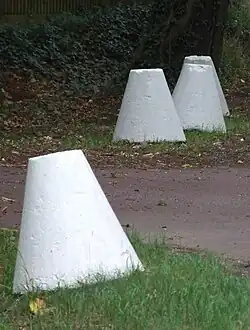 Buoy is a British type of anti-tank obstacle used to block roads intended to impede enemy movement.[1] Buoys were widely deployed during the invasion crisis of 1940–1941. Each buoy was a truncated cone with a rounded bottom which was constructed out of concrete. They would be placed in at least five rows across a roadway.