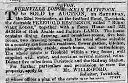 In 1819 the whole of William Sleman’s property was sold including East Langstone. A description of the large number of assets that he owned in the Tavistock area is given in this reference.[5] John James and his wife Anne bought the East Langstone estate. He renamed the house “Burnville Lodge” but retained the name of the nearby East Langstone Farm. Later the whole of the estate was called Burnville.